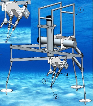 1) ROV deployable frame, 2) measurement volume, 3) sensor